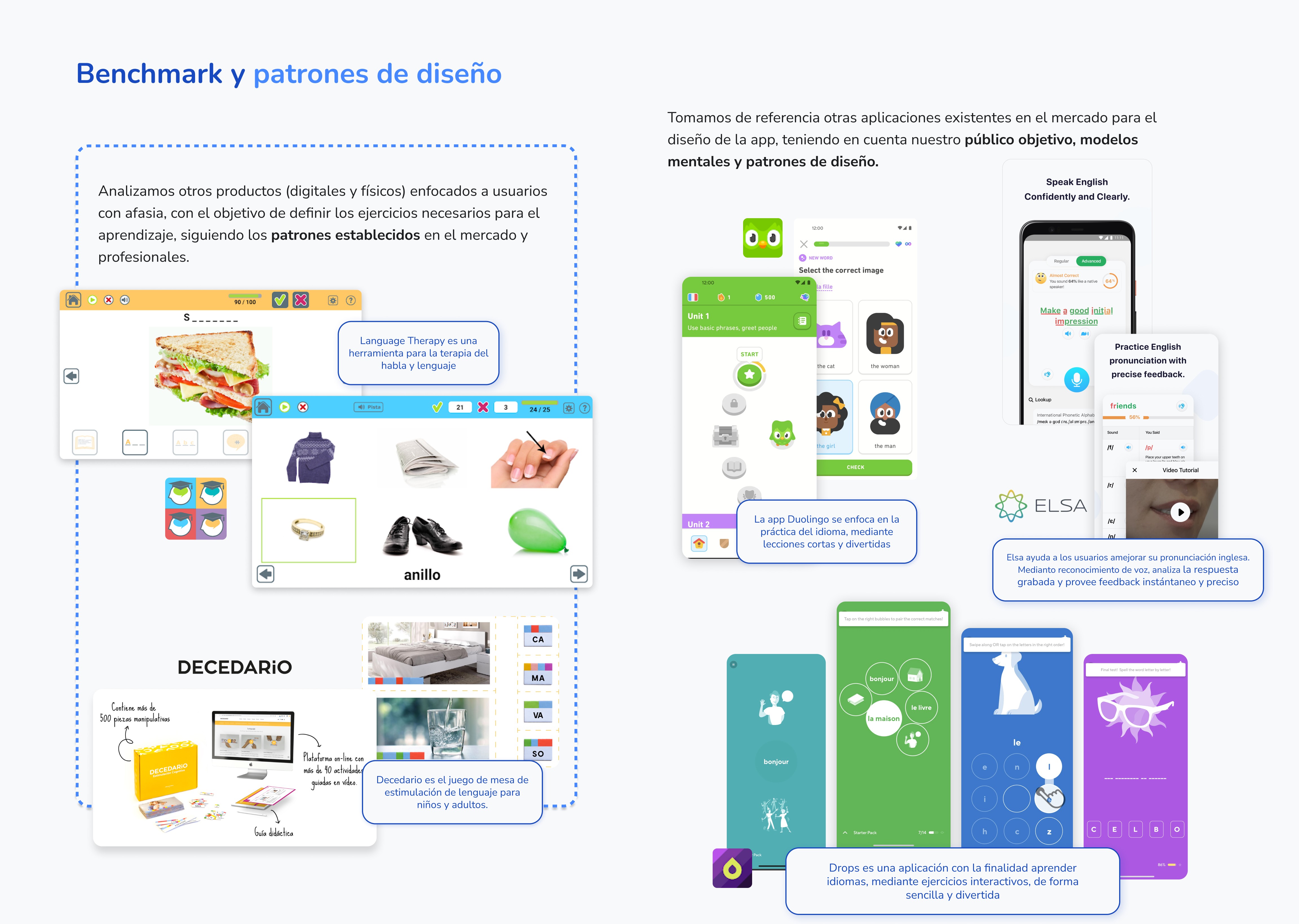 We analysed products (digital and physical) focused on users with aphasia, with the aim of defining the necessary exercises for learning, following the established patterns of the market and professionals.